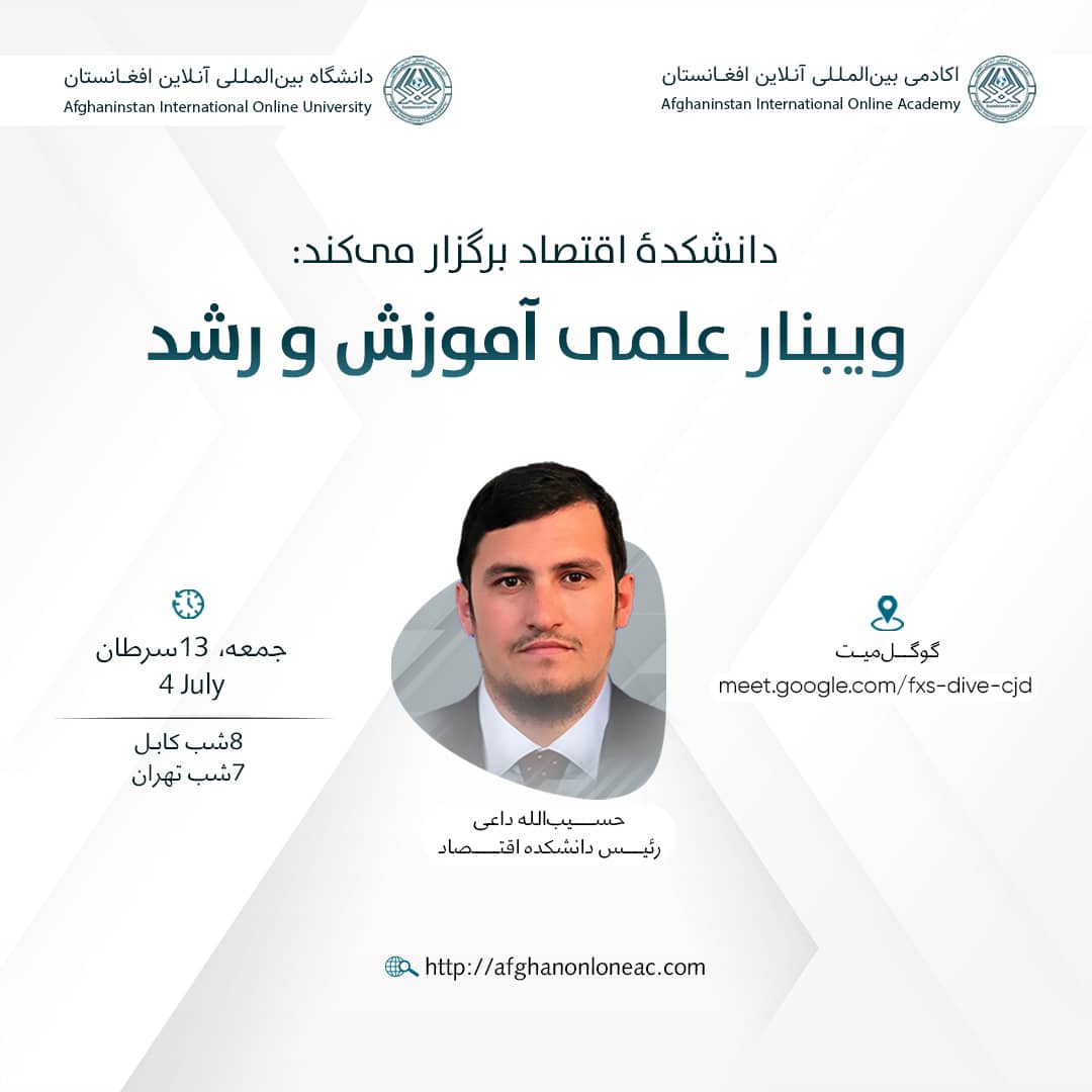 دانشکدهٔ اقتصاد دانشگاه بین‌المللی آنلاین افغانستان(AIOU) وبینار علمی را تحت عنوان “آموزش و رشد: بررسی تأثیرات تعلیم و تربیت در توسعه و پایداری کشور” توسط استاد حسیب الله داعی رئیس دانشکدهٔ اقتصاد برگزار می نماید.