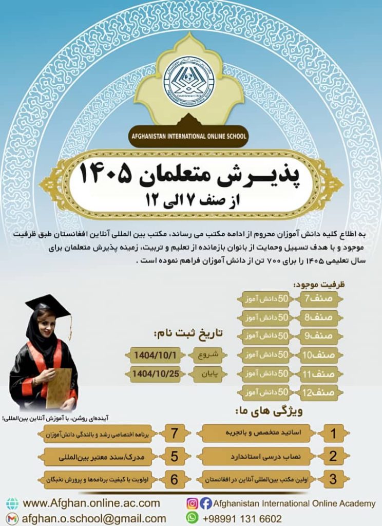 مکتب بین‌المللی آنلاین افغانستان، با هدف تسهیل و حمایت از دانش‌آموزانی که از ادامه مکتب محروم مانده‌اند، پذیرش دانش آموزان را برای صنف های هفتم تا دوازدهم برای سال تعلیمی ۱۴۰۵، ۲۰۲۵ تدارک دیده است. در این راستا، ظرفیت ۳۰۰ نفر از دانش‌آموزان را فراهم نموده است. از متقاضیان محترم دعوت می‌شود تا با رعایت شرایط لازم، نسبت به ثبت‌نام اقدام فرمایند.