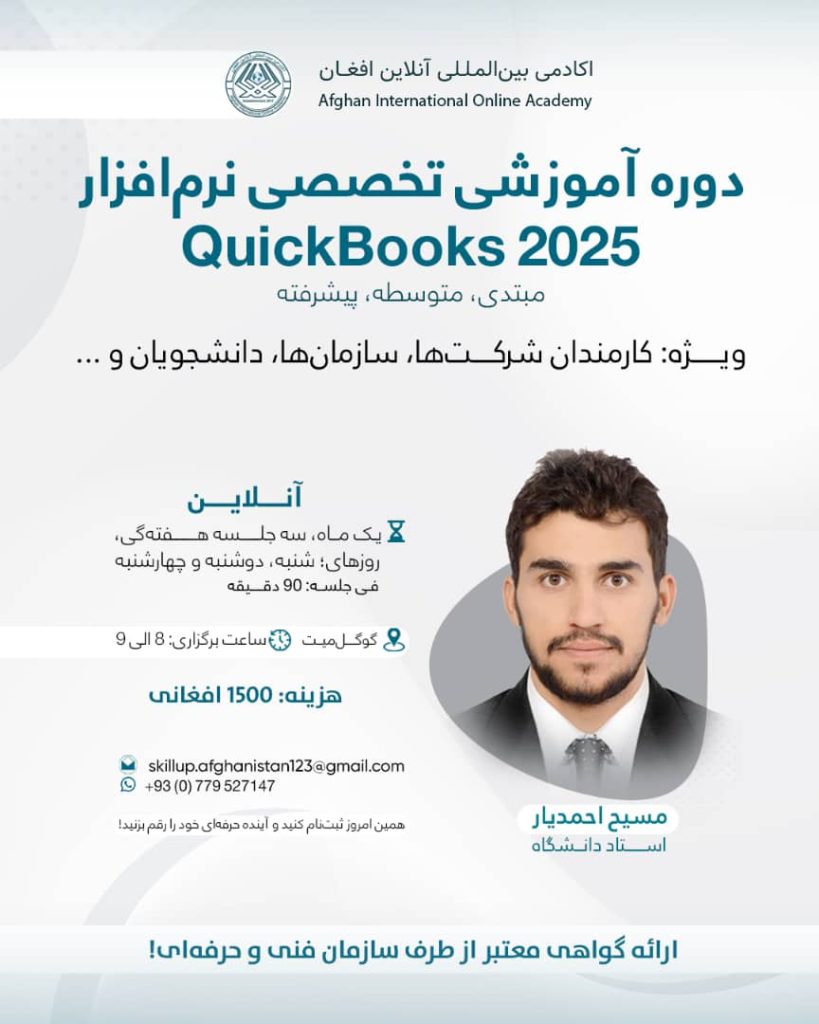 مرکز آموزشهای کوتاهمدت و مهارتآفرین افغانستان (Skillup Afghanistan) دوره تخصصی و عملی نرمافزار حسابداری QuickBooks 202 را با هدف ارتقاء مهارتهای مالی و حسابداری در بین دانشجویان، فارغالتحصیلان و کارمندان سازمانها و شرکتها برگزار میکند.