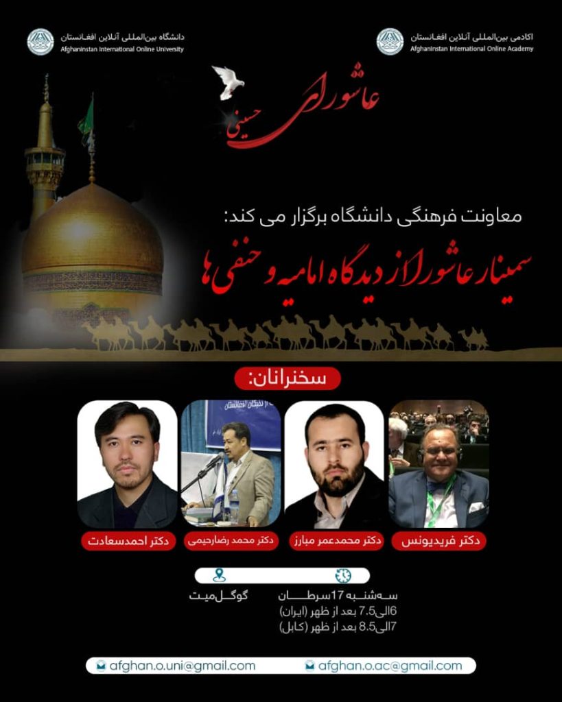 معاونت فرهنگی دانشگاه بین المللی آنلاین افغانستان سمینار علمی فرهنگی با عنوان”عاشورا از دیدگاه امامیه و حنفی ها” را برگزار می نماید.