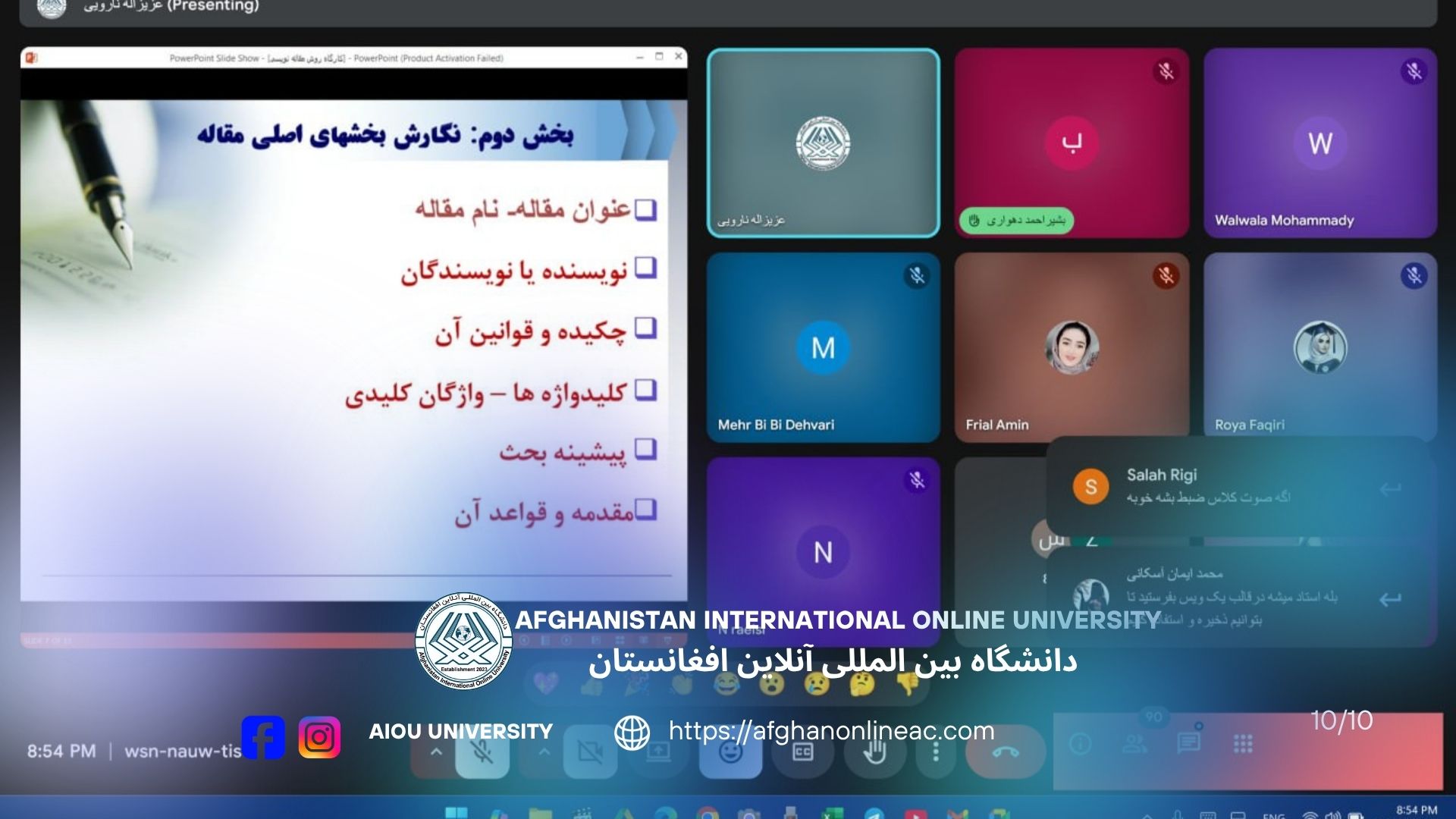 دانشکدهٔ شرعیات دانشگاه بینالمللی آنلاین افغانستان، کارگاه «مقالهنویسی» را برای دانشجویان و استادان این دانشکده برگزار کرد. این کارگاه با تدریس استاد عزیزالله نارویی، رئیس دانشکده شرعیات، و با حضور 100 شرکتکننده برگزار شد.