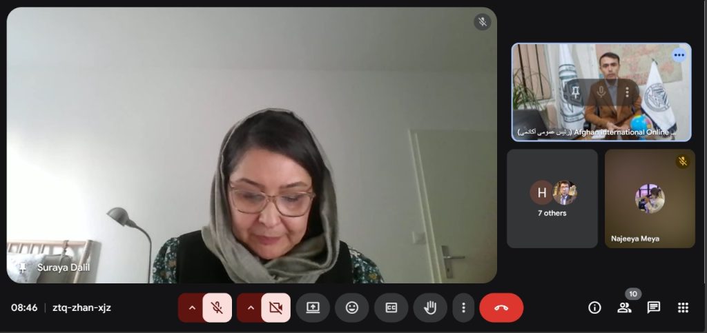 داکتر ثریا دلیل، وزیر اسبق صحت عامه افغانستان، ضمن تبریک به خاطر فعالیت‌های ارزشمند آکادمی در جهت ارتقای آگاهی و علمی زنان افغانستان، بر اهمیت بهره‌گیری از مؤلفه‌های (کرامت انسانی، زنان، محیط زیست و …) در تعاملات بین‌المللی و تقویت جایگاه علمی تأکید کردند.