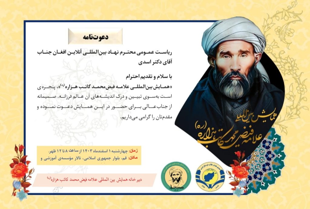 از دبیرخانه همایش بین‌المللی علامه فیض‌محمد کاتب هزاره صمیمانه تشکر و قدردانی می‌نمایم بابت دعوت به شرکت در این همایش مهم و ارزشمند. خیلی علاقه‌مند بودم که در این همایش بین المللی حضور بیابند، متأسفانه به دلیل سفر دیگری که در پیش دارم، نمی‌توانم در این همایش حضور یابم.